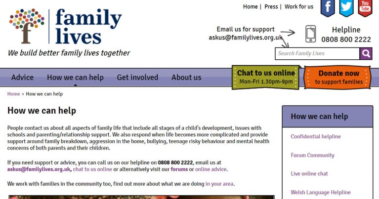 Family Lives is a charity that helps people with all aspects of a child’s development, issues with school, parenting and relationship support. They also provide support around family breakdown, aggression, bullying, risky behavior and mental health concerns.